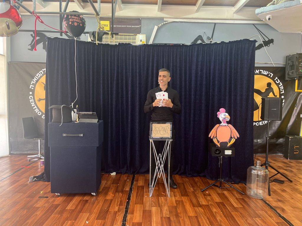 בכל חבילה אני מביא איתי מערכת הגברה איכותית (הפועלת על סוללה, כך שאין סכנת כבלים), מוזיקת רקע, אפקטים קוליים ותפאורה מושקעת שנותנת למופע תחושה של “תיאטרון”. אני מגיע עם המזוודות, הציוד וכל מה שצריך כדי להרים הופעה.